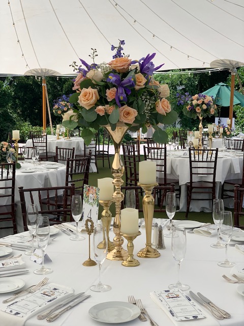 $178 – tall centerpiece in rental gold stand (included) for reception