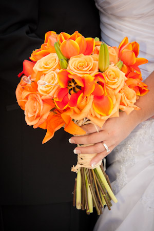 Autumn tulips, roses & lilies in orange