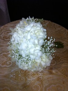 white bouquet hydrangea, baby’s breath & orchids