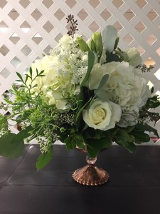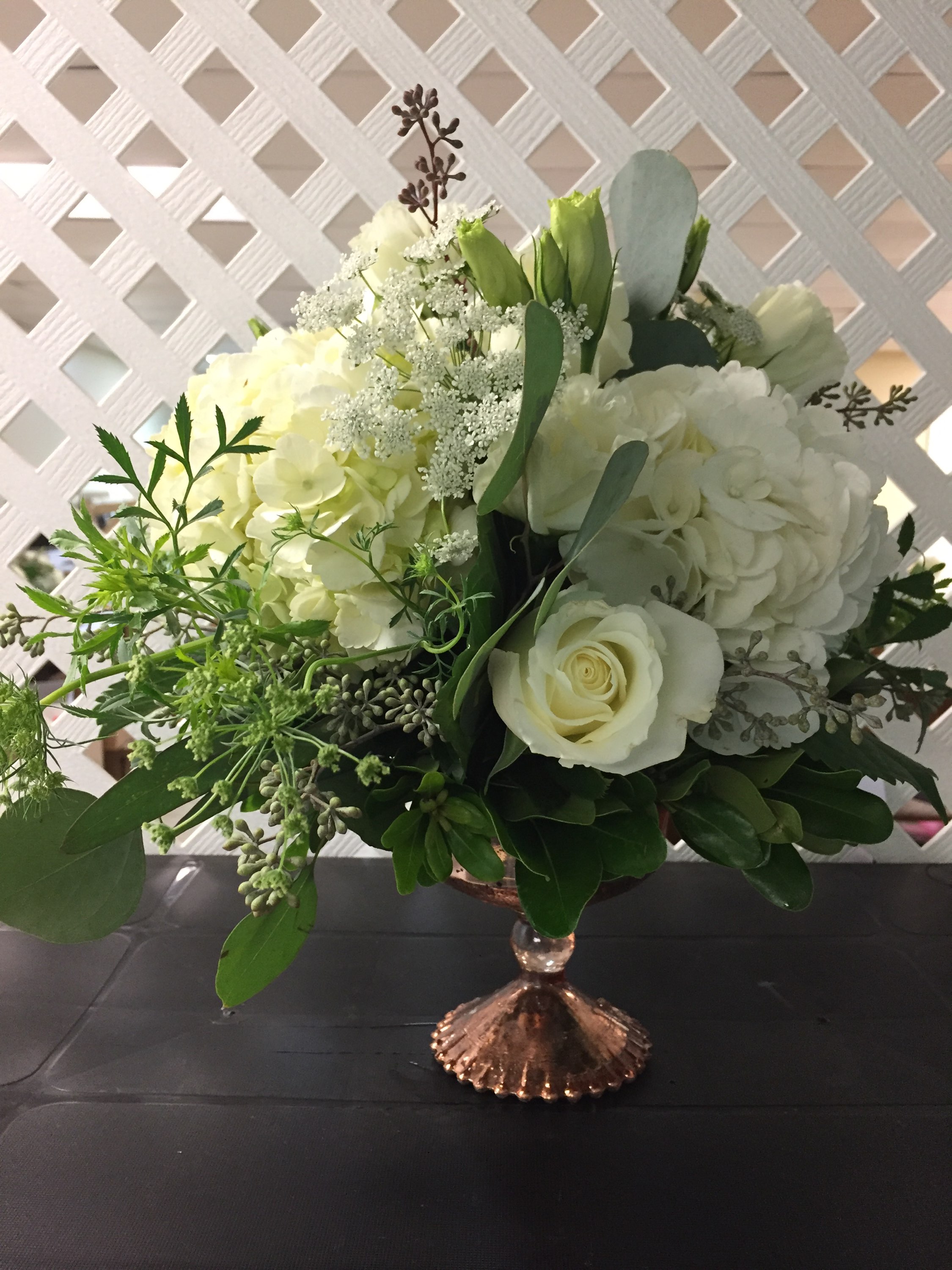 compote centerpiece with white hydr white rose queen anns lace seeded