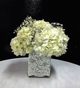 low hydrangea baby’s breath lace wrapped cube centerpiece
